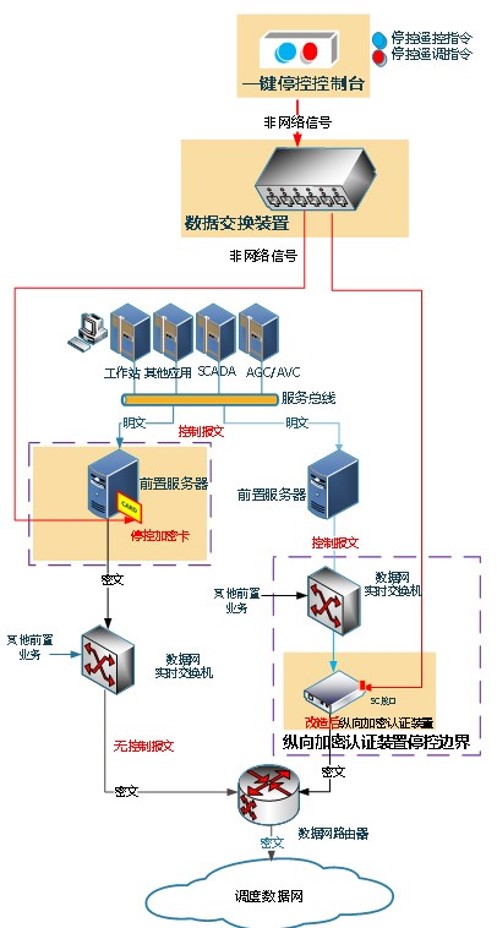 停控縱向加密認(rèn)證裝置:基于縱向加密認(rèn)證裝置進(jìn)行改造的新型裝置,具備識(shí)別控制臺(tái)指令,用于防止主站網(wǎng)絡(luò)安全事件的影響向廠站大規(guī)模蔓延,默認(rèn)情況下處于縱向加密認(rèn)證裝置的原有工作模式運(yùn)行,緊急情況下可通過非網(wǎng)絡(luò)方式啟動(dòng)阻斷模式運(yùn)行,阻斷攔截主站下發(fā)廠站的遙控、遙調(diào)命令,以下簡(jiǎn)稱“停控縱向裝置”。