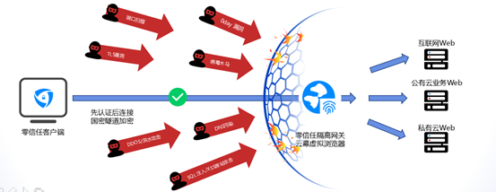 建立終端到遠程隔離服務的國密加密隧道,隧道根據終端運行環境和用戶身份安全評級實現隧道動態建立和銷毀,始終保持最小訪問授權。
